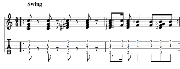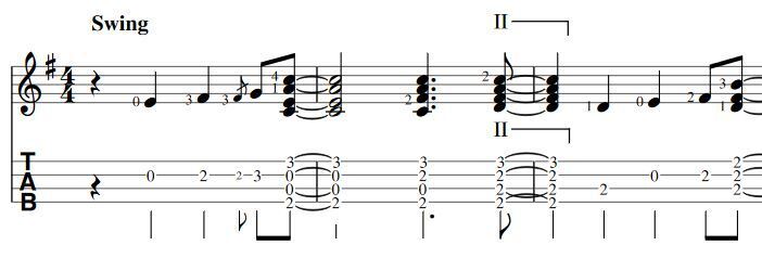 With the same fingering, can be played both with a fingerstyle arpeggio and with a more rhythmic strumming.